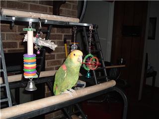After two months in my house, he will step up if he has a really good reason. Like an almond. Or “get me away from that silly grey parrot”. He lets me spray him with a mister so that he gets a bath. He is learning to use foraging toys.