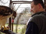 Refuge last night for my regular weekly round of getting everyone clean and fed and medicated and to sleep after work. In addition to the 50 or 60 parrots in the house, we have a resident red-tailed hawk named Pierce in the backyard aviary. She has an amputated wing and cannot survive in the wild. The picture is Pierce with Rich, our director.
