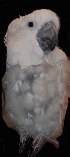 This is Fred, an Umbrella Cockatoo. He is very friendly and not much trouble, relative to other cockatoos I know. Just about every Wednesday, I let Fred out of his cage straight away. He likes to come out and climb on his roof and have a snack and see everyone. He is so easy-going that the only reason I can think of that he has not been adopted is that he is a feather picker. Proves to me that people are dumb (says she with the most beautifully feathered African Grey in all the land).