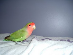 I mentioned that the Refuge was pretty badly flooded, so I decided to bring another bird home. Cobalt, who I believe is called a peach-faced love bird, came to the us with Precious the blue crowned conure (I really don’t know if I have these species right).