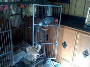 I mentioned that Eloise, an African Grey from the Refuge, is spending a couple of weeks at my house. She is a rather nervous bird – a feather picker, even. Kiwi the Grey makes her nervous, because she is always going airborne and Eloise has had her flight feathers clipped (I have confirmed with our director that they will be grown out). So I can’t really let her out to play in any place that Kiwi is likely to want to be. Mostly, she hangs out on or about her cage, and I give her lots of snacks because her weight is still low. Which attracts the dog. So Eloise spends most of her play time like this: