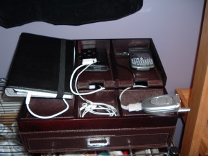 Pictured are the Kindle my brother gave me for Christmas, my iPod, my work Blackberry and then my personal cell phone down in front. That I haven’t turned on in months.