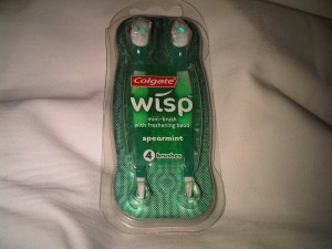 I had seen the Colgate Wisp advertised, but hadn’t tried them. I thought it was a brilliant idea but I don’t like the price. I think it was $2.50 for a 4-pack. But I forgot to pack toothpaste on this, of all trips, when I didn’t have to worry about getting liquids through airport security. So I tried them.