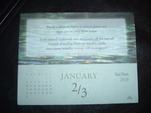 I was telling you about my new box calendar – “365 Little Ways to Save Our Planet”. On the weekend, there was a combined page. How are they going to do 365 Little Ways if every weekend is doubled up? There are two tips on the weekend page. So: