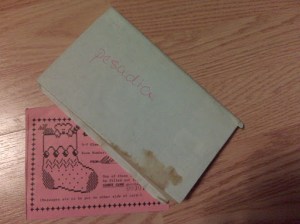Oh, hell. So I went to into my library to look for it. It took awhile because it was still wrapped up – in a book cover way, with the actual English assignment – “supposing that our district was facing the prospect of having Catcher in the Rye banned…” There appear to be Diet Coke stains on the piece of paper – which also have my name and the title of the book written in purple ink in handwriting that was once mine and the word “pesadia” on the back in pink ink, in handwriting that I don’t quite recognize. Kris used to write in pink, though. What does “pesadia” mean, anyway? Cursory Google search gave me nothing.