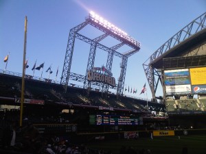 I went to the Mariners game last night with Joy and some other colleagues. Safeco Field is a perfectly nice stadium and it was a lovely night. The retractable roof was open and it was the second home game of the season. The place was probably more than half full, but not by much.