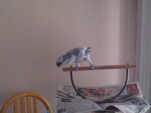 I brought Sigmund home this weekend when I returned from DC. He had done fine most of the time I was gone, but started picking his feathers again a couple of days before. He seems happy enough and comfortable at my house and we want to see if we can get him to leave the feathers alone. He is a great bird – incredibly adoptable – he just looks funny.