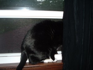 When we got upstairs, I opened the bedroom window and put him in the window sill. Happy again. That night, I went to sleep with the window open – he was still in the window sill. 2am, I was awakened by the rain and couldn’t close the window because he was still in it.