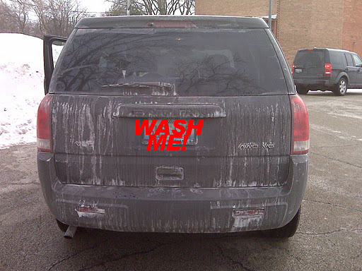This is a picture of my car from the winter before last.  I was blogging about this awesome phenomenon in Chicago, where on the first clear Saturday we all go to the car wash.  Sit in the queue for 45 minutes for the privilege of paying 10 bucks to wash the road salt off our vehicles.  Personally, I stop at the ladies room and pick up a Big Gulp before getting in line.