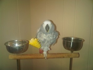 One trip to Washington and a few thunderstorms later and Sigmund has pulled all his feathers out again. But we learned that he liked corn on the cob.