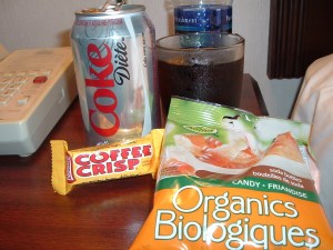 There is a 24-hour drugstore down the street so I picked up a case of Coke Diete and some snacks for the week. Going down the snack aisle I saw all the different Canadian things and got all excited. I settled on organic gummy cola bottles (apparently, “organic” in French is “biologique” and a Nestle candy called Coffee Crisp. It seems to be like a Kit Kat, but chubbier and coffee flavored. Awesome. And then I found a little diner around the corner. I was going to get a simple grilled cheese sandwich and a cup of soup, but the guy next to me wouldn’t shut up about the mac and cheese. Then the jerk went and ordered lasagna. But I think I might eat there every single day.