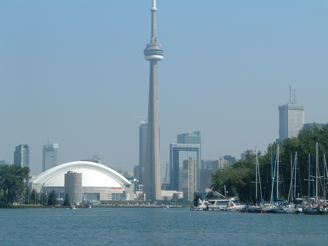I took the subway down as close as I could get to the “harbourfront”, which in Chicago would be called “the lakefront”. I meant to hike over to the famous CN Tower, but my little guidebook said it would be $20+ to go up the elevator and jump on the glass floor so I opted instead to spend my $20+ on the one-hour harbour cruise, where I took this shot. Cutting off the top of the tower with my over-eager zoom button.