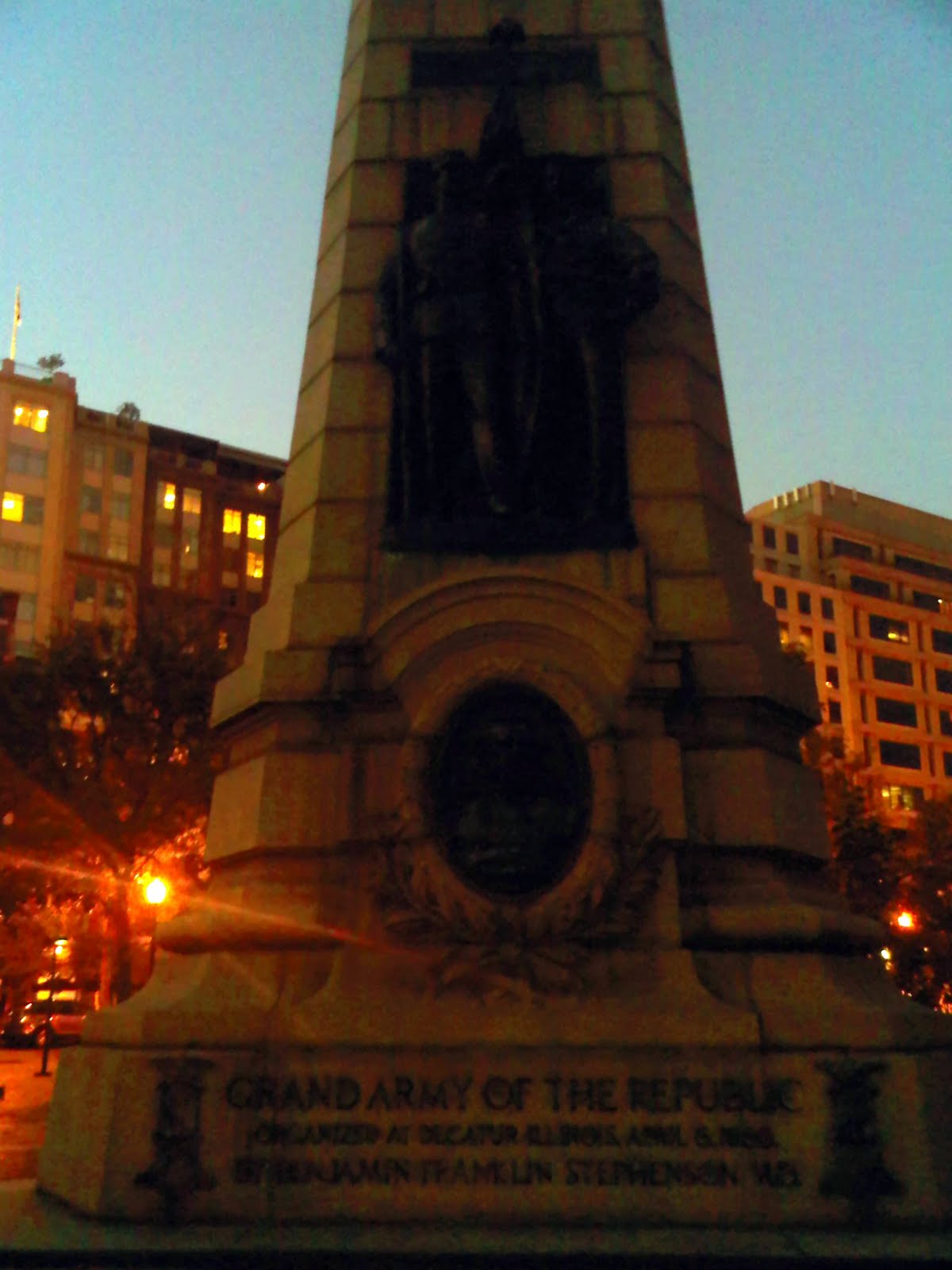 Second, I had dinner with RetiredBoss and his lovely wife tonight. That was the only thing that made me remotely want to get on an airplane this morning. So I walked over to Gallery Place after work to meet them at the ChopHouse. First time since last spring that it wasn’t so hot and humid that one couldn’t reasonably walk that far. We had a great meal and caught up. (Retirees love to hear the old workplace gossip and I can always use a fresh audience.) Walking back, it was all DC at Night – like the postcards. I only snapped this one little pic, in the spirit of Things I Never Really Noticed Before: a memorial for the Army of the Republic founded in 1866 in Decatur, IL. It is in Indiana Plaza.