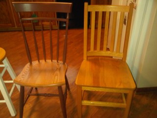 How do you find four to six chairs to match an old table? I looked at the usual stores and found nothing. Then one day early this summer, I was in… TJMaxx/Marshall’s/HomeGoods…- one of ’em – and found two pale oak chairs. $150 for the pair. There were only two and I wasn’t sure they would match, but they were real wood and sturdy so I went for it. They work great. I started looking for them at every other TJMaxx/Marshalls/HomeGoods in the area. No luck. For months I kept looking.