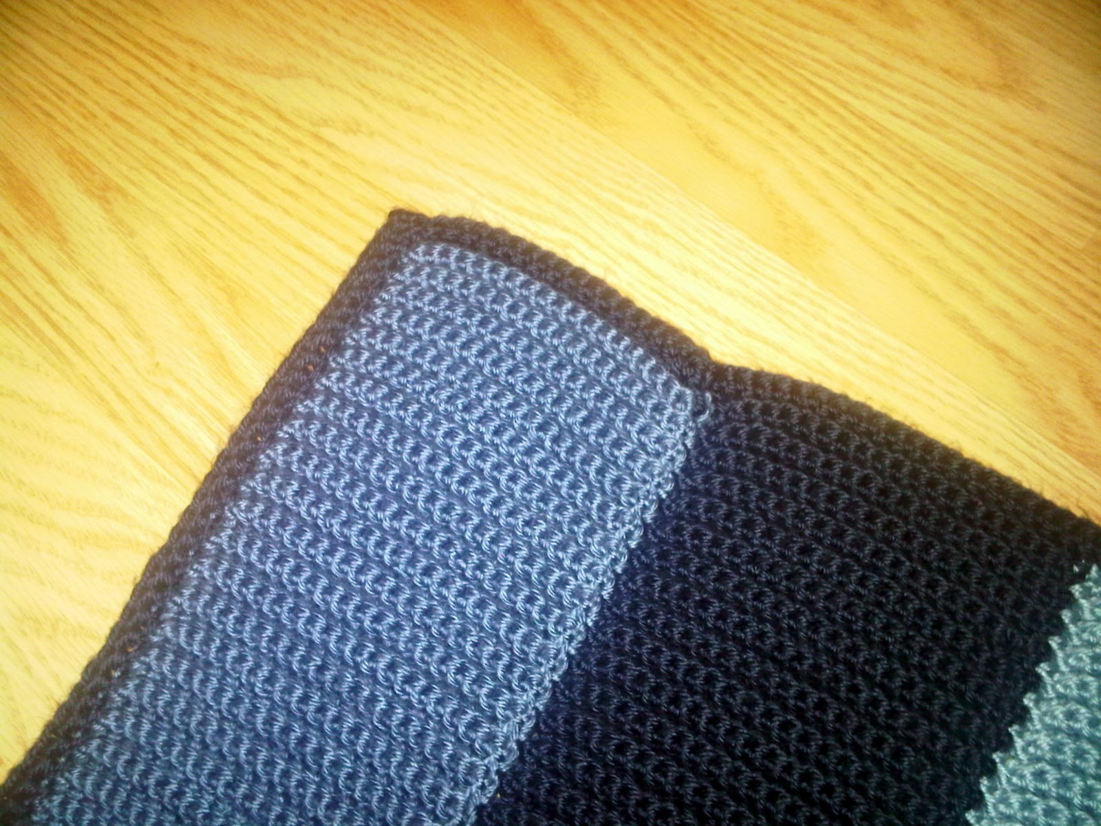 Twelve strips crocheted together, and then I did two finishing rows around each end. Being all careful not to make rounded corners, because my mother doesn’t like that (rolls eyes).