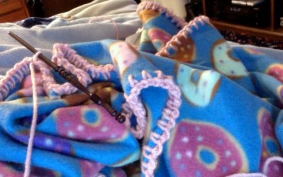 I seriously think those are doughnuts. If I weren’t doing the edges in pink, I might be inclined to call this The Homer Simpson blanket. Wait. Homer Simpson wouldn’t care if his blanket was edged in pink, as long as there were doughnuts involved.