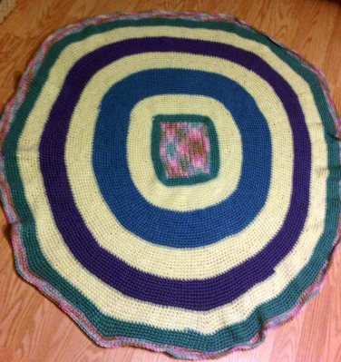 I did circles rather than rows because I have no concept of how far any given amount of yarn will go. My mother says it looks like a baby throw rug. But it is soft and colorful and I am sure there is a kid out there that will appreciate it.