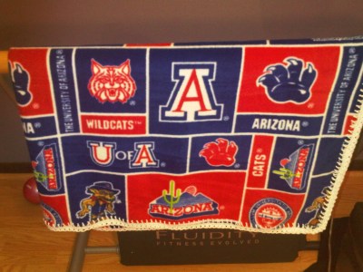 Not sure how many kids in Chicago would dig a University of Arizona Wildcats blanket, but there must be at least one. Three rows of single crochet in White Lion Brand Pound of Love yarn.