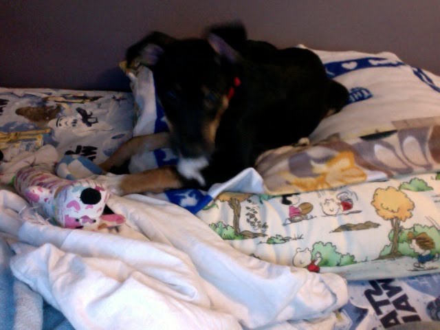 This week, we learned that Gibbs is ok with the storms. After that first incident, we had another one come through Thursday night. Because he had gone potty before it started, he pretty well slept through it. However, he had gotten up onto my bed by then. Friday morning, I had an appointment, so he went into his crate. Then this happened: