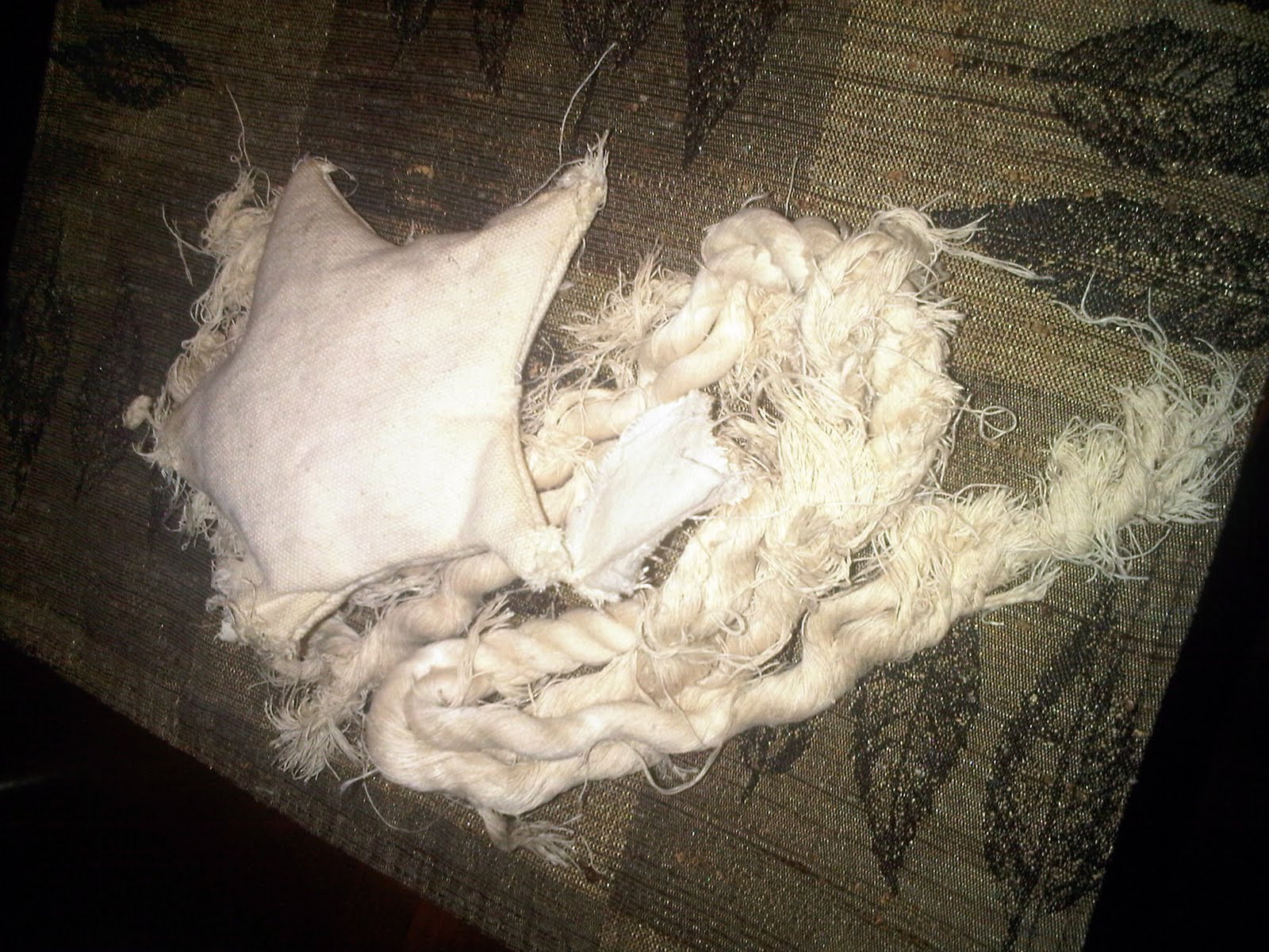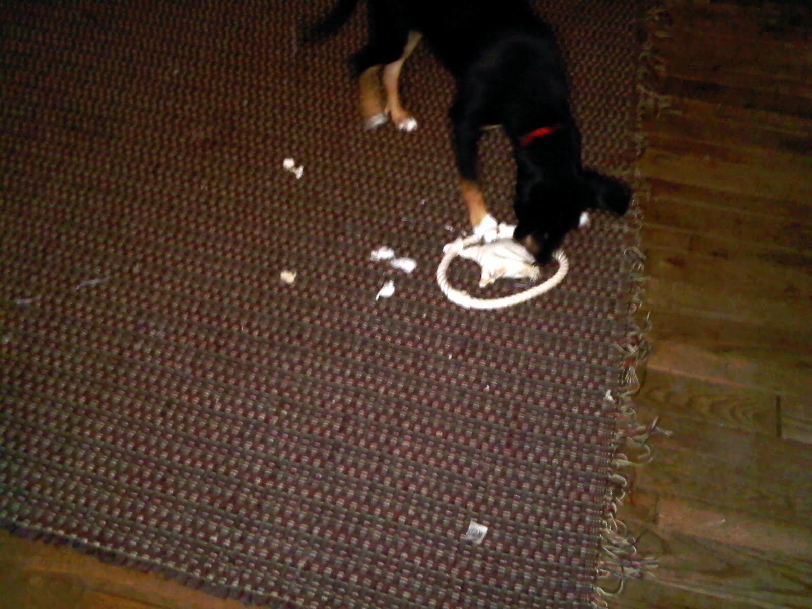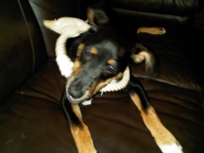 This is why Gibbs needs so many toys. This one was a “natural” toy – cotton star with stuffing and secured to a rope for tossing and tugging. I gave it to Gibbs before I left for the library last night. My mother sent me a picture: