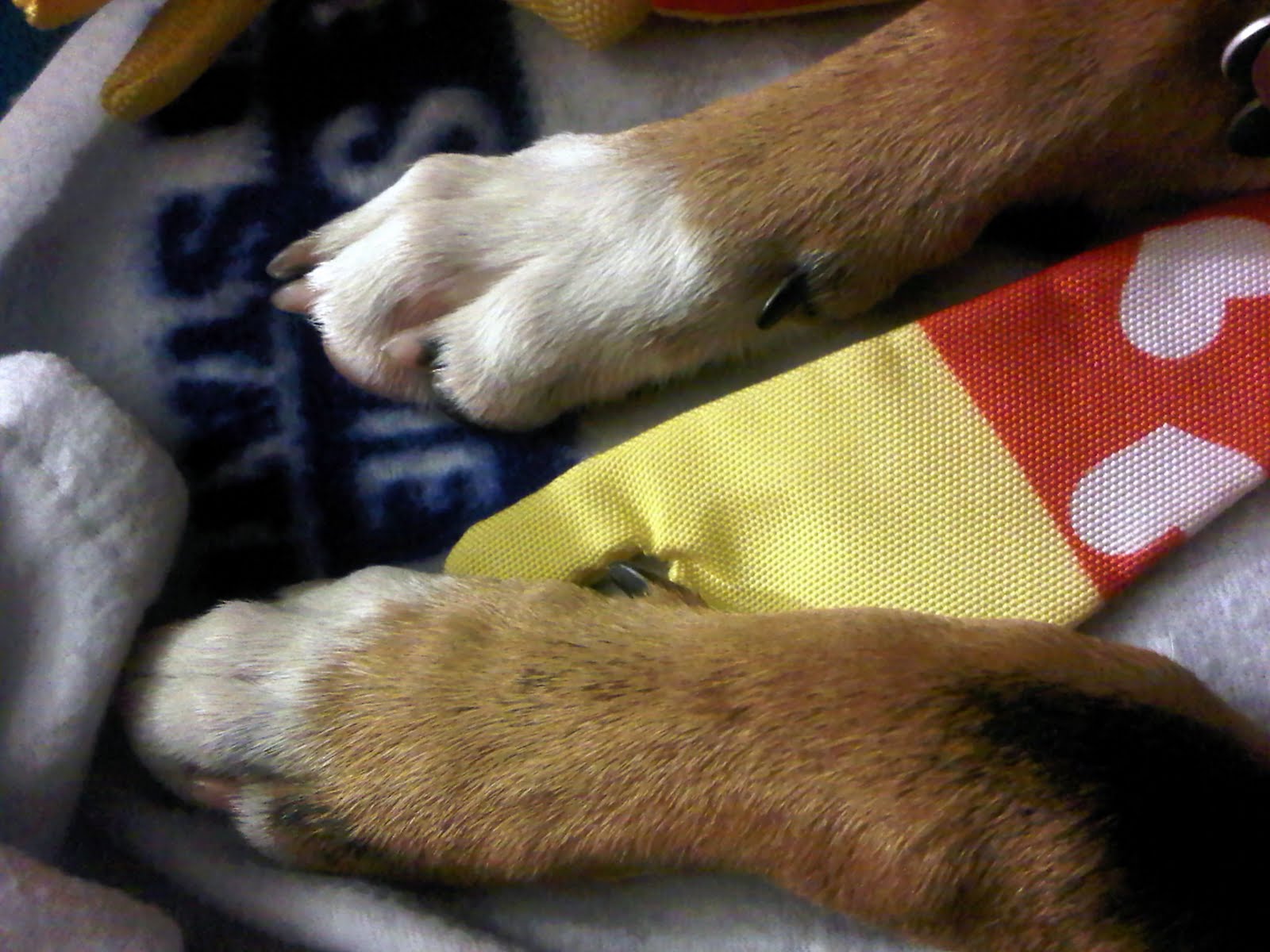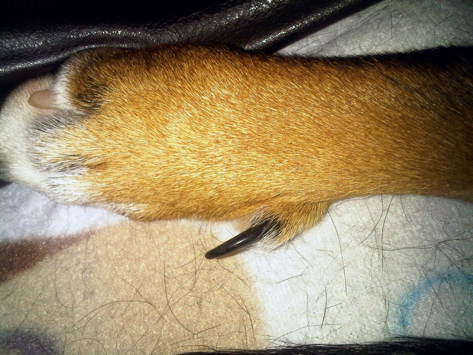 But just so you believe me, these are his front paws.  You can see the dew claws are relatively straight and point in the right direction: