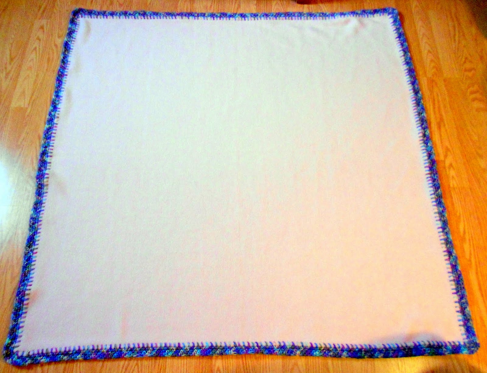 The lighting here is so messed up that you can’t even tell that the fleece is pink. The yarn was Red Heart’s Monet. Four rows, single crochet.