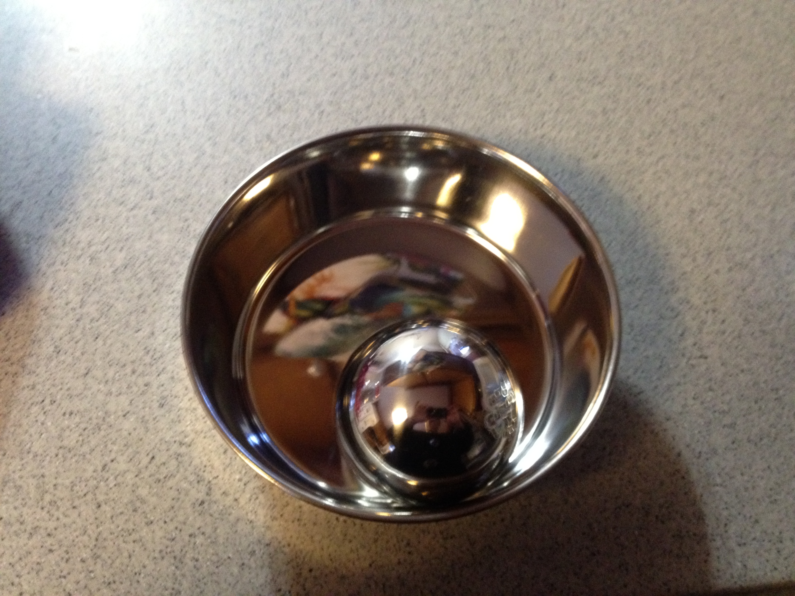 For ten bucks, it was worth a try.  Last weekend. I put the ball into his regular stainless steel bowl and poured his dinner over it.