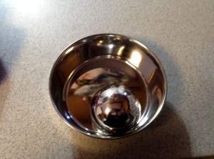 Except the store didn’t have it.  I wandered around awhile and found the Omega Paw Steel Portion Pacer.  It is a small stainless steel ball that you place in the bowl.  The dog has to work around the ball to eat his dinner.