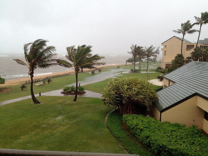 It has rained for close to 48 hours straight. On the north side of Kauai, they have literally evacuated people to a Red Cross shelter and there was at least one school closed. Roads are out and the flash flood warning – extended twice – is set to expire in 30 minutes.