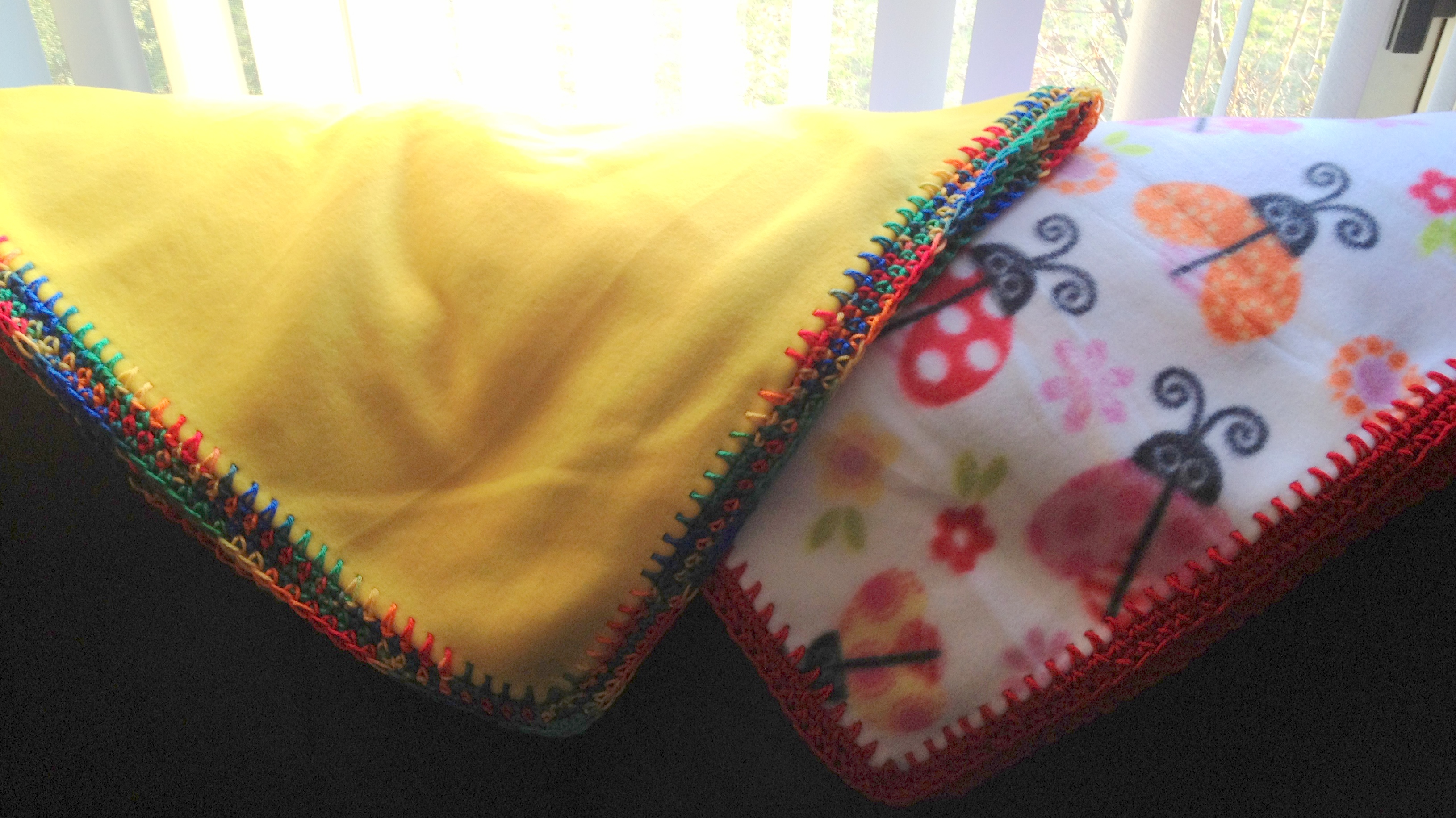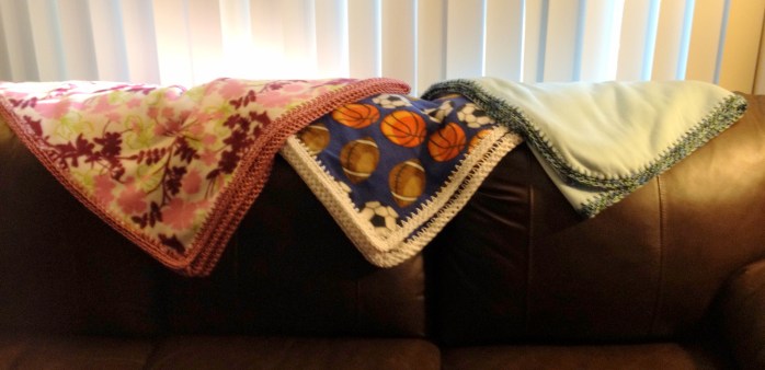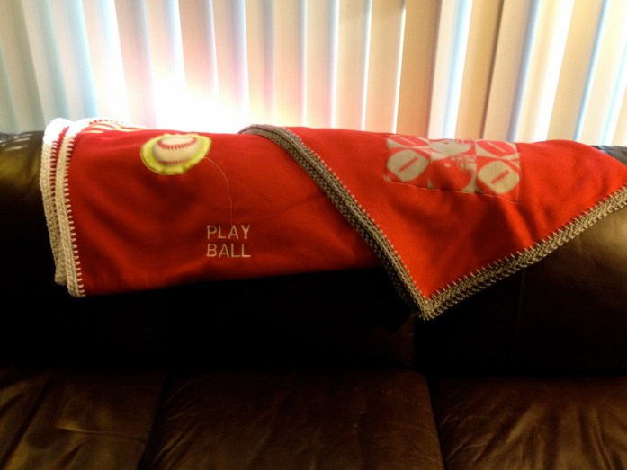 Both use scraps of patterned fleece to accent the solid fleece. Plus the one on the left includes the line “Play Ball” embroidered from a sewing machine. On the left I used Caron’s white yarn and the right has Caron Simply Soft in Grey Heather.