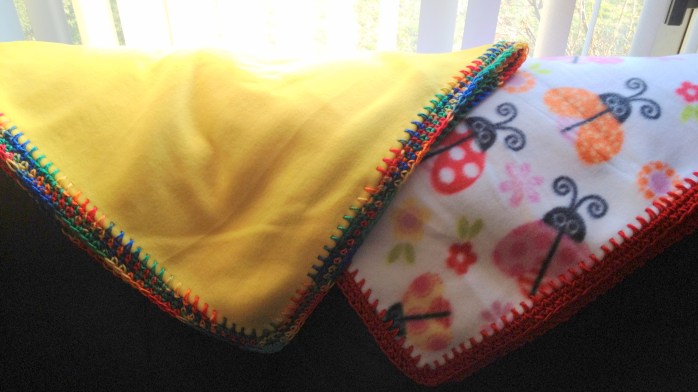 The solid yellow has one of the Red Heart Kids yarns – I forget the name. The lady bug blanket has Red Heart’s Cherry Red. I am so glad I picked up the giant skein of that one.