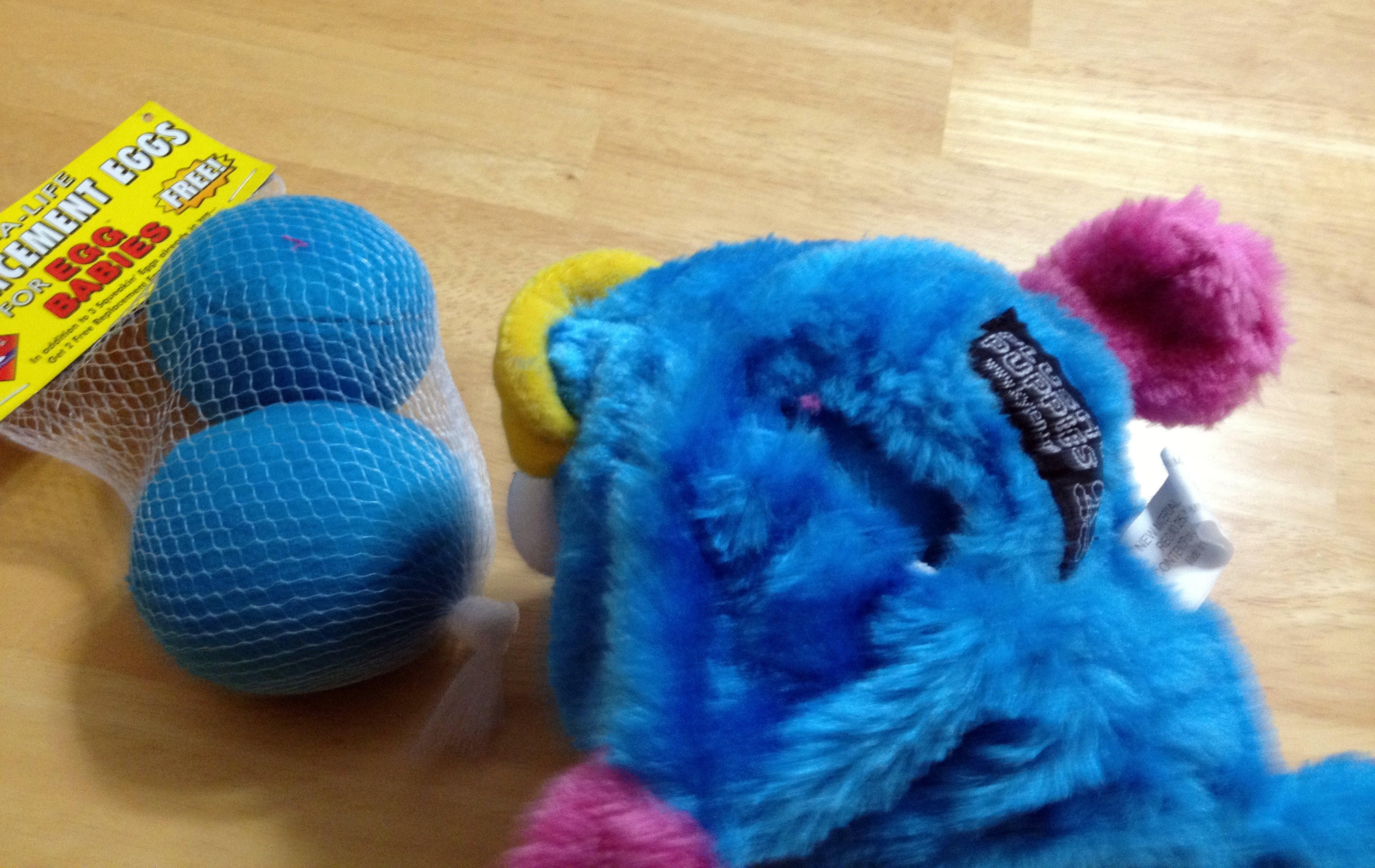 The hole where the eggs go is elastic and just a bit harder for the dog to dig the toy out. And the fish one doesn’t have any other stuffing inside, so it stays intact (Although Gibbs tore off the eyeballs and the lips. Damn weirdo.) The size of the eggs is in the same neighborhood as a tennis ball, which he loves. And there are replacement eggs for when he loses them under a different couch!