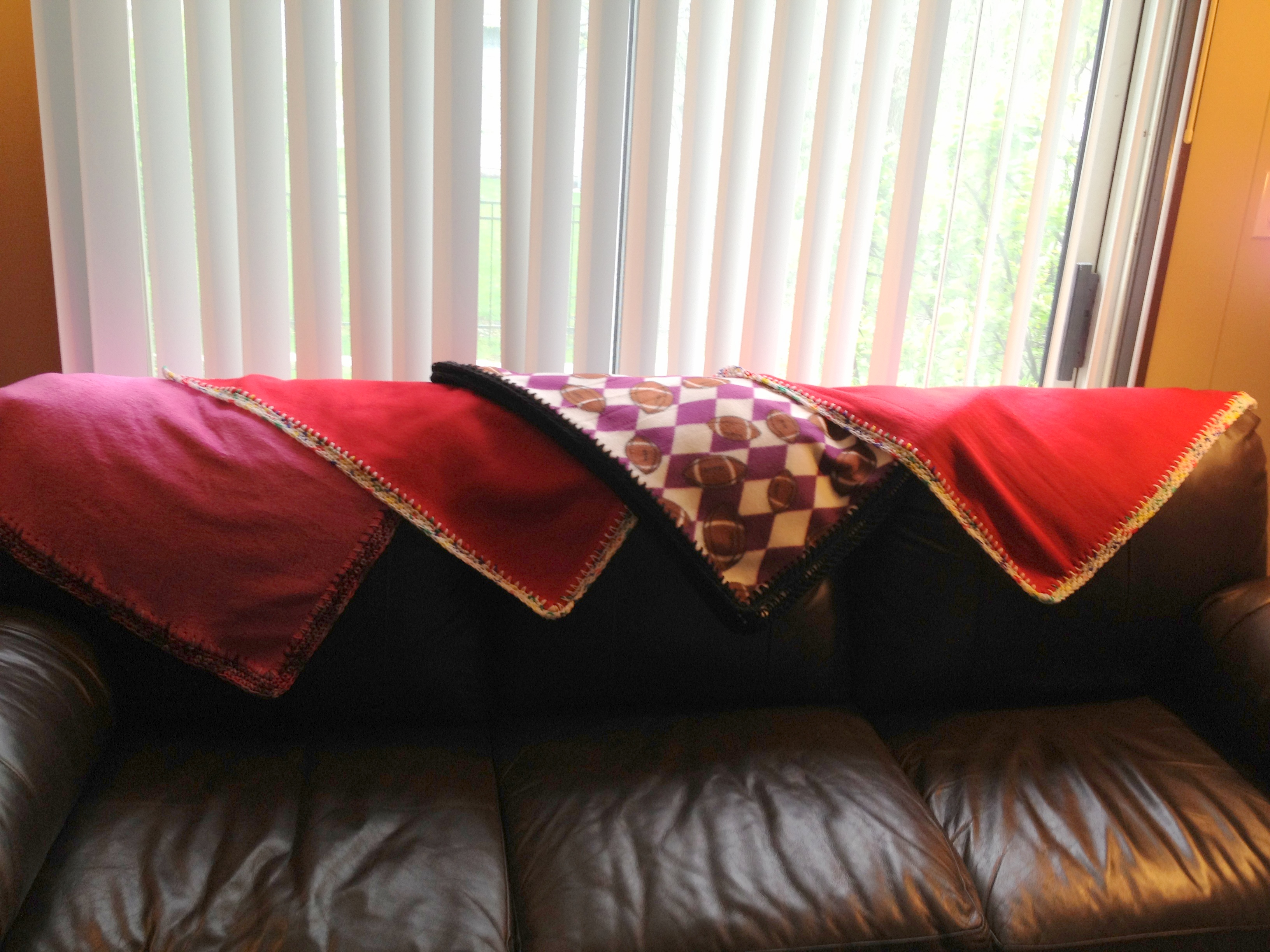 The two solid read one had a brand of yarn I don’t remember, but the color was called “circus print”. The one with the footballs used Caron Simply Soft in Black and the pink one looks like Red Heart in Plum Pudding.