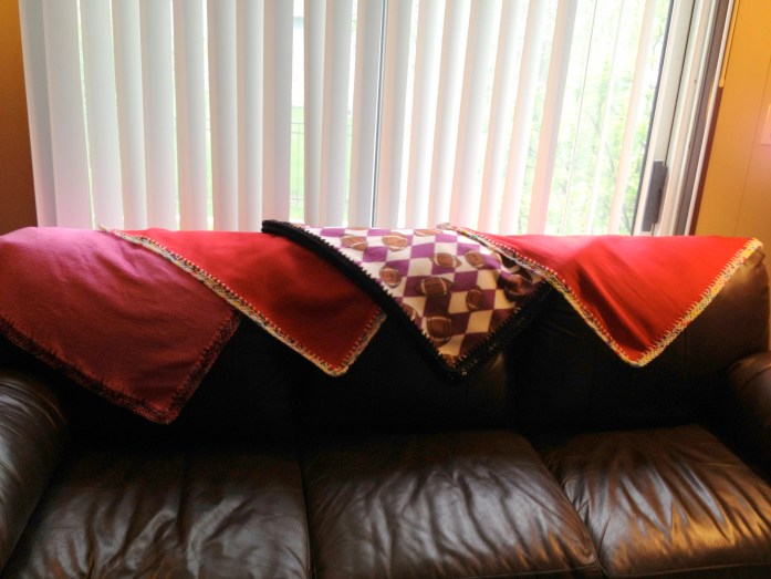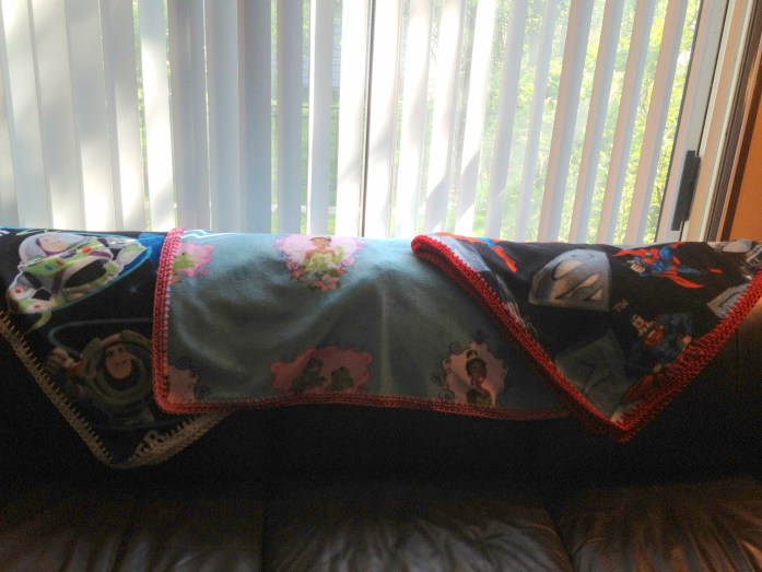 This was easier since they were licensed prints. The Superman was Red Heart’s Red. The Toy Story was Caron White and the Tiana was Red Heart Light Raspberry. So I brought seven finished to Starbucks night. And still haven’t finished the big, red one.