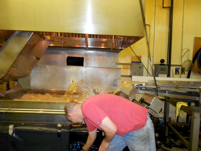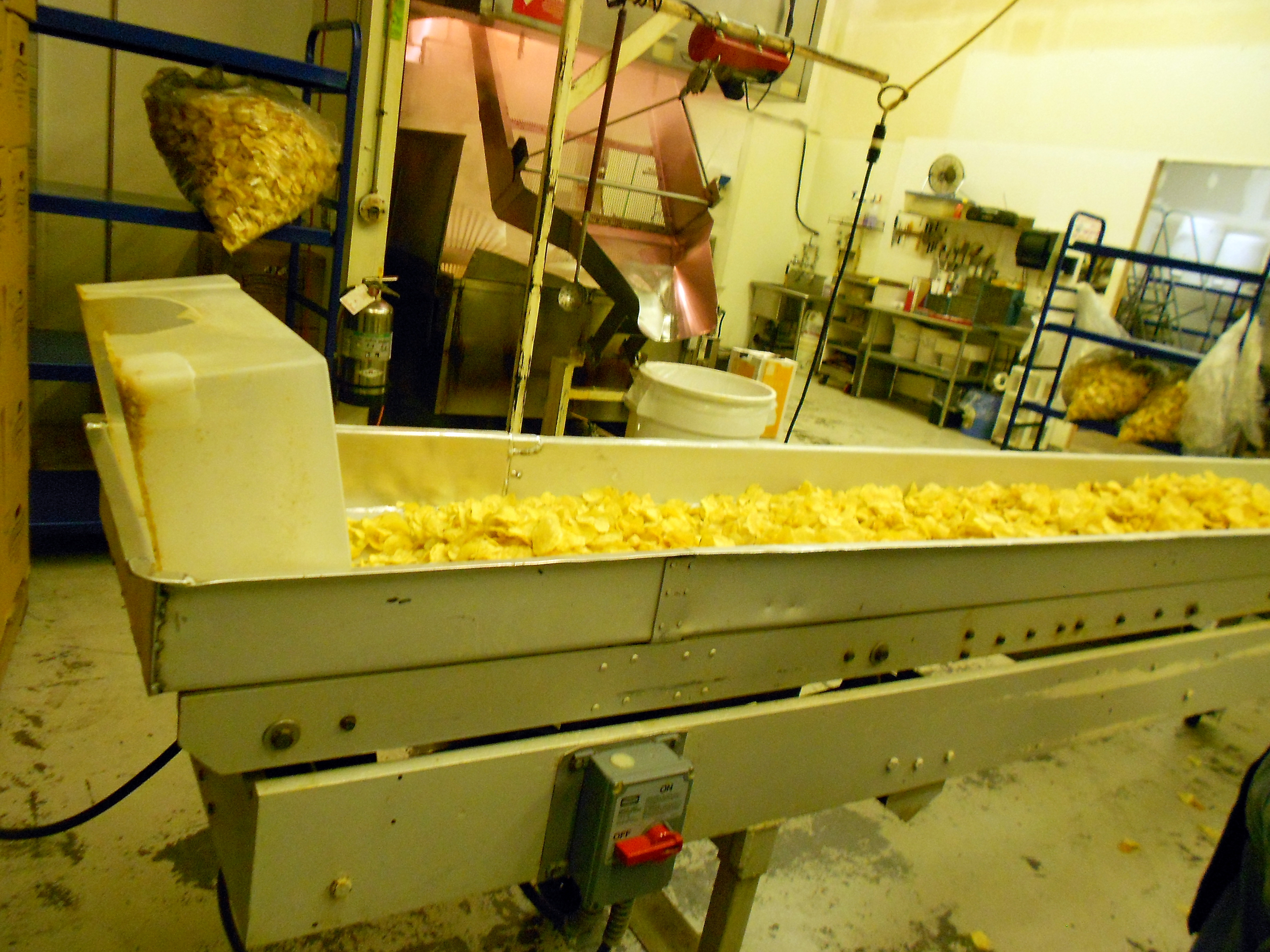 Mr. Carney, the proprietor, told us all about the process and I managed to take an action shot of the peeler/slicer shooting chips into the fryer: