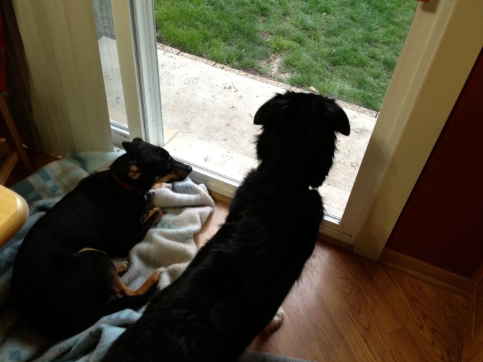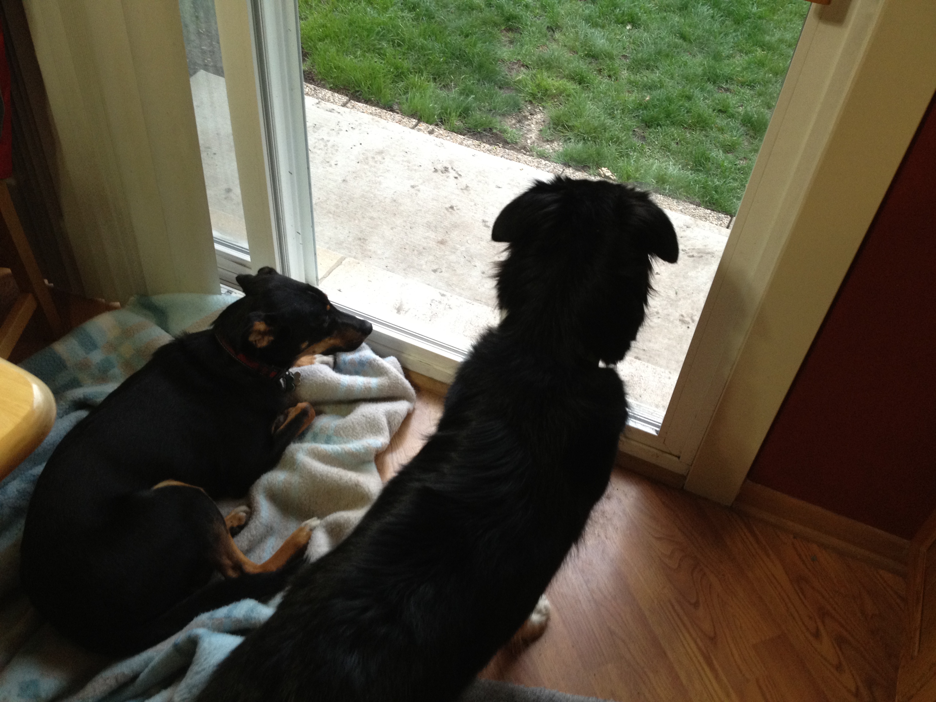 First morning potty break. Gibbs is at the door first, but Fiona shoves past him and tears outside to run two laps around the perimeter of yard to be sure we are safe from demons and squirrels. Gibbs walks out a dozen steps and pees. Then he wanders a bit to find the best place to do the rest of his business. Upon completion, he returns immediately to the porch because he knows it is time for breakfast. Hopefully, by this time Fiona has urinated and we can go inside. But sometimes not.