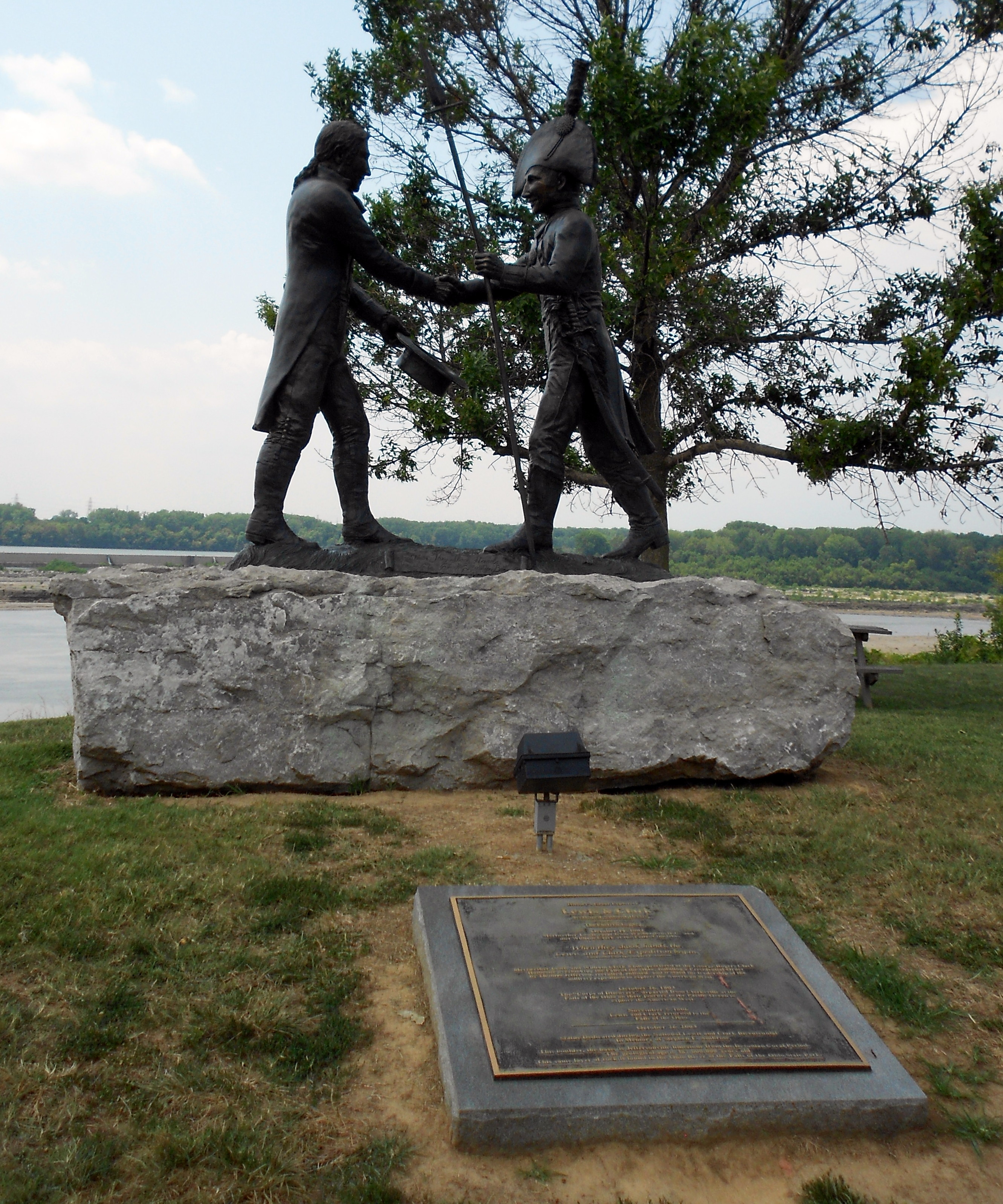 We had an afternoon free, so a few of us took the Louisville city tour. First stop was in..Indiana. The Ohio Falls with the statue of Lewis & Clark: