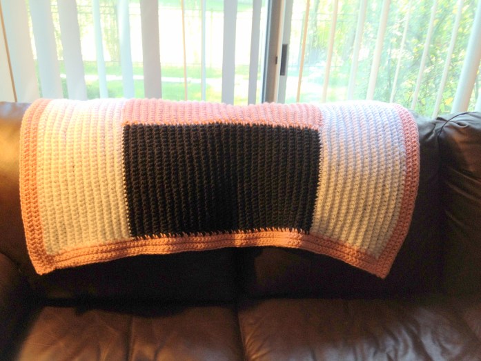 You can expect to see at least one more just like it. I’m not out of grey pieces yet. Lion Brand Vanna Yarn in Pink, White and ..some kind of grey