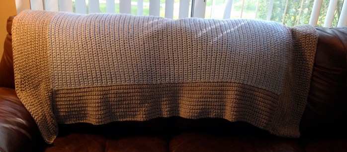 Which is what happens when you want to fully crochet something large. Caron Simply Soft in Country Blue and Heather Grey.