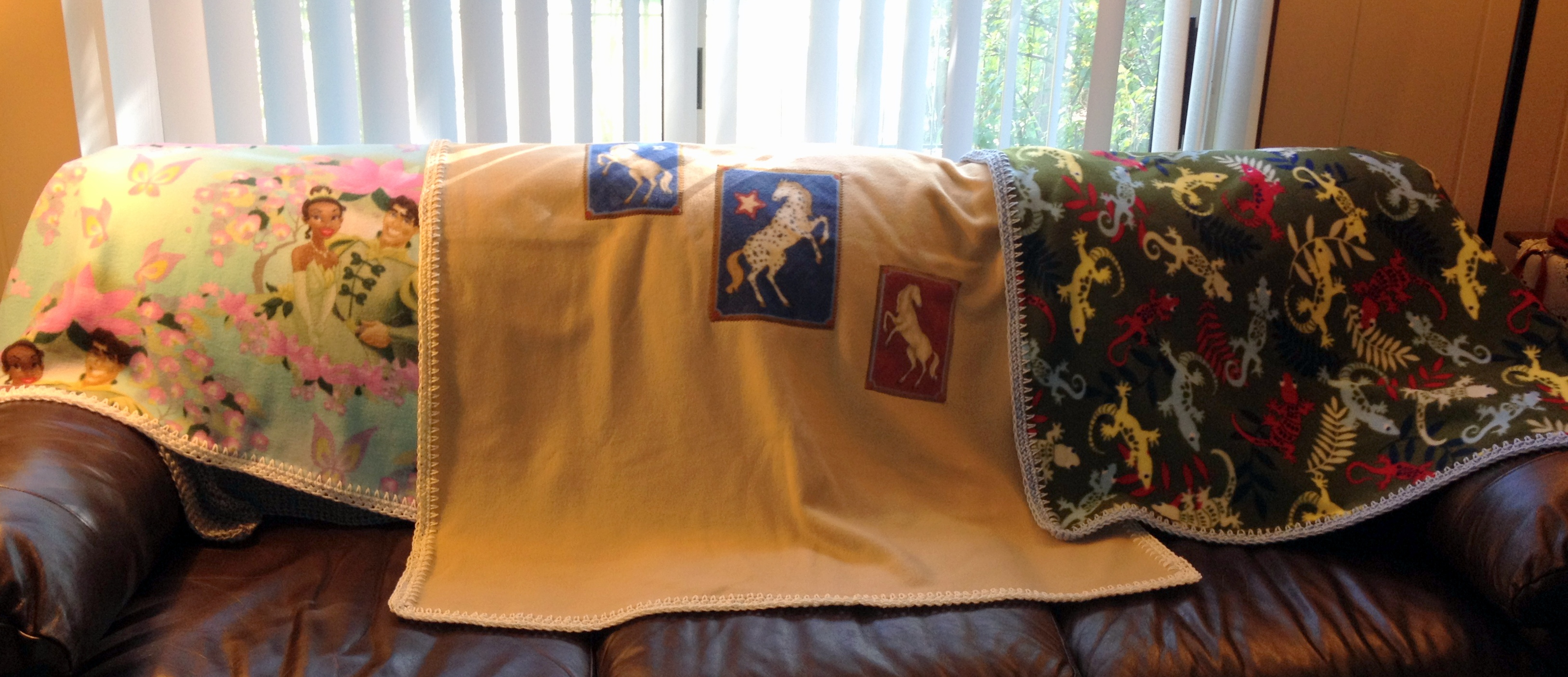 See that one in the middle? Solid camel colored fleece. The horses were sewn on by another volunteer from some leftover fleece pieces. I used a cream colored yarn – Red Heart, probably – and it turned out nicely. And we have more Disney princesses, with Caron white yarn. I also used Caron yarn with the awesome lizards, but I don’t remember the name of the blue.