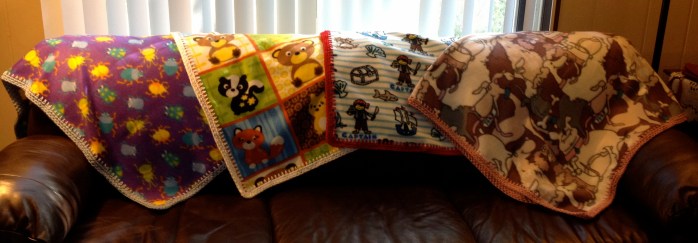 Nine in one month seems like a lot, but the two fully crocheted had been in progress forever and a couple of the fleece pieces were baby blankets.