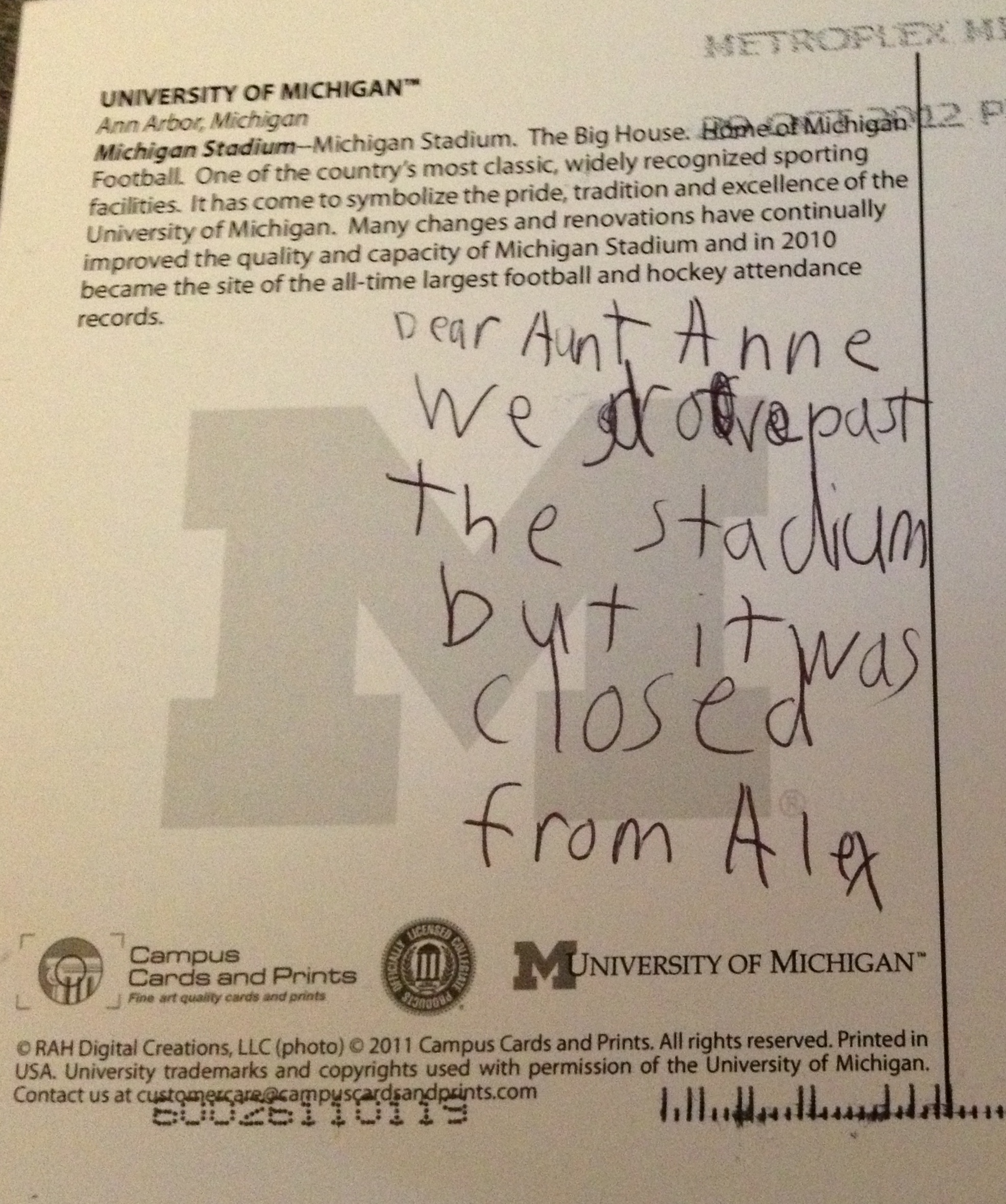 “Dear Aunt Anne: We drove past the stadium but it was closed. From Alex.”