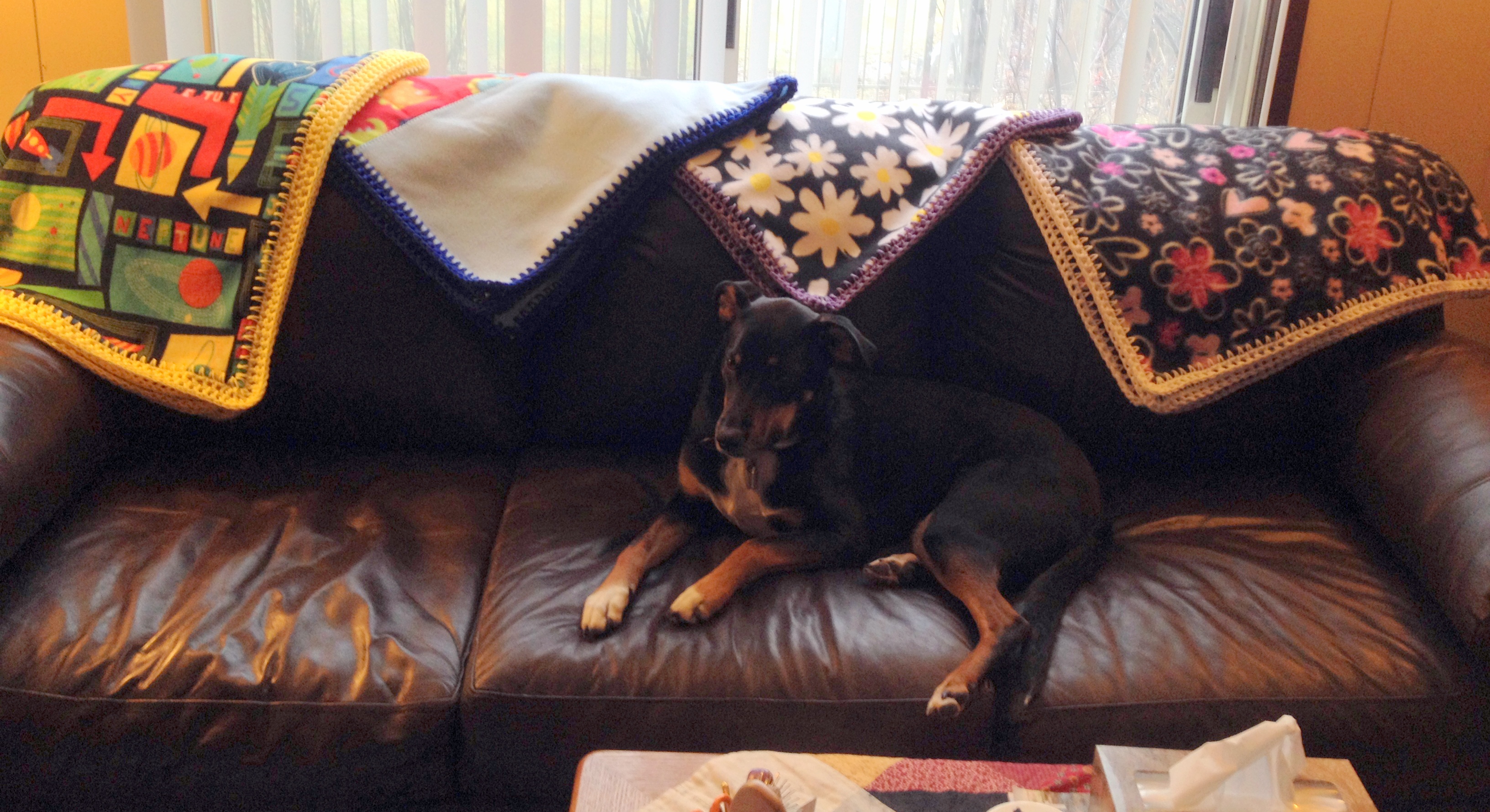 Today was the big Blanket Day for my chapter of Project Linus. I brought eight (modeled by Gibbs, who wouldn’t get off the couch):