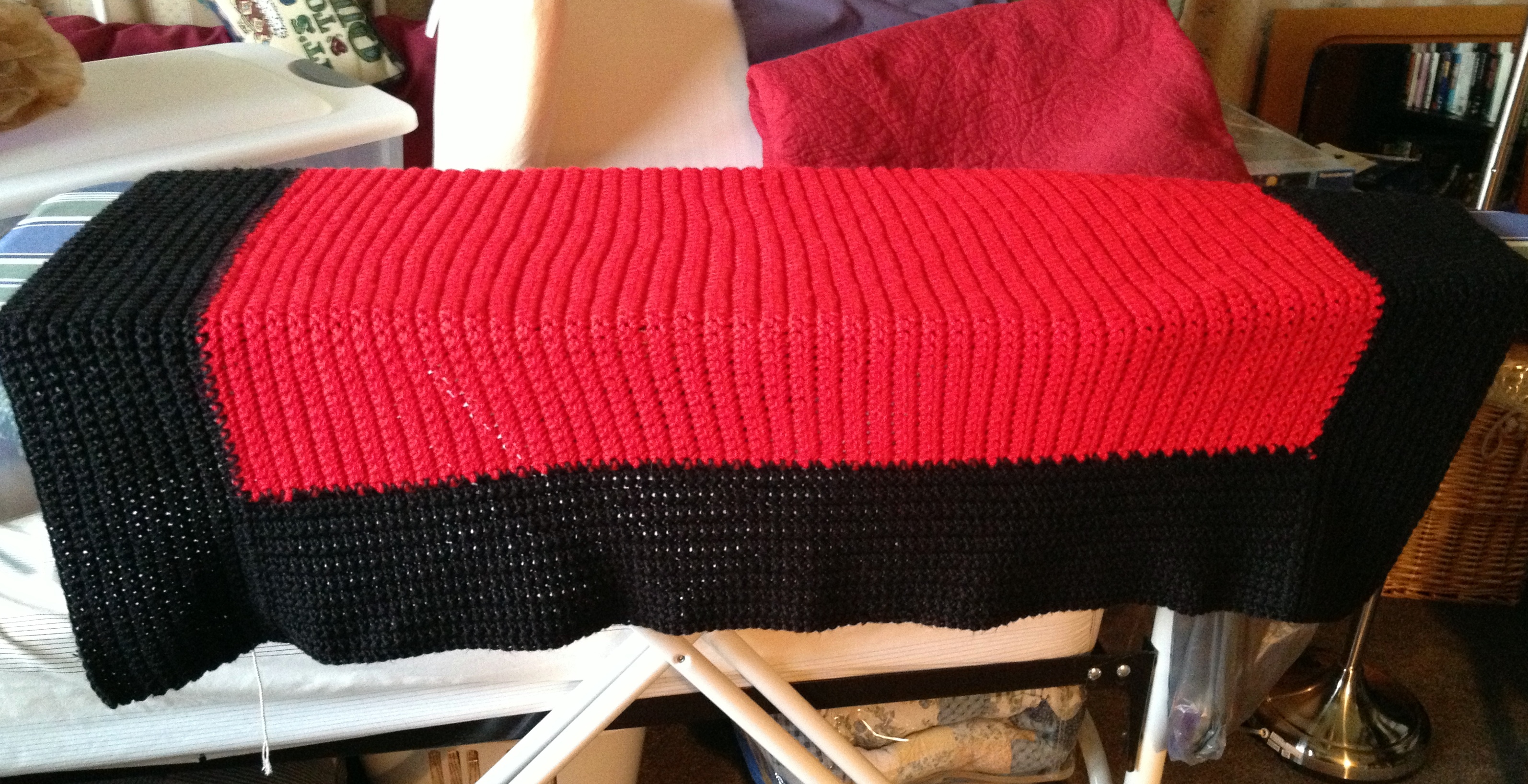 The yarn is Lion Brand’s Vanna White Baby yarn in Little Boy Blue and Lamb. The last row is a simple double crochet, inasmuch as I was desperately running out of yarn. When I turned it in last Monday, the ladies all said that my stitches were even, which I guess is how one judges the work. So I was very happy. Next we have single crochet with Caron Soft yarn in…red and black.