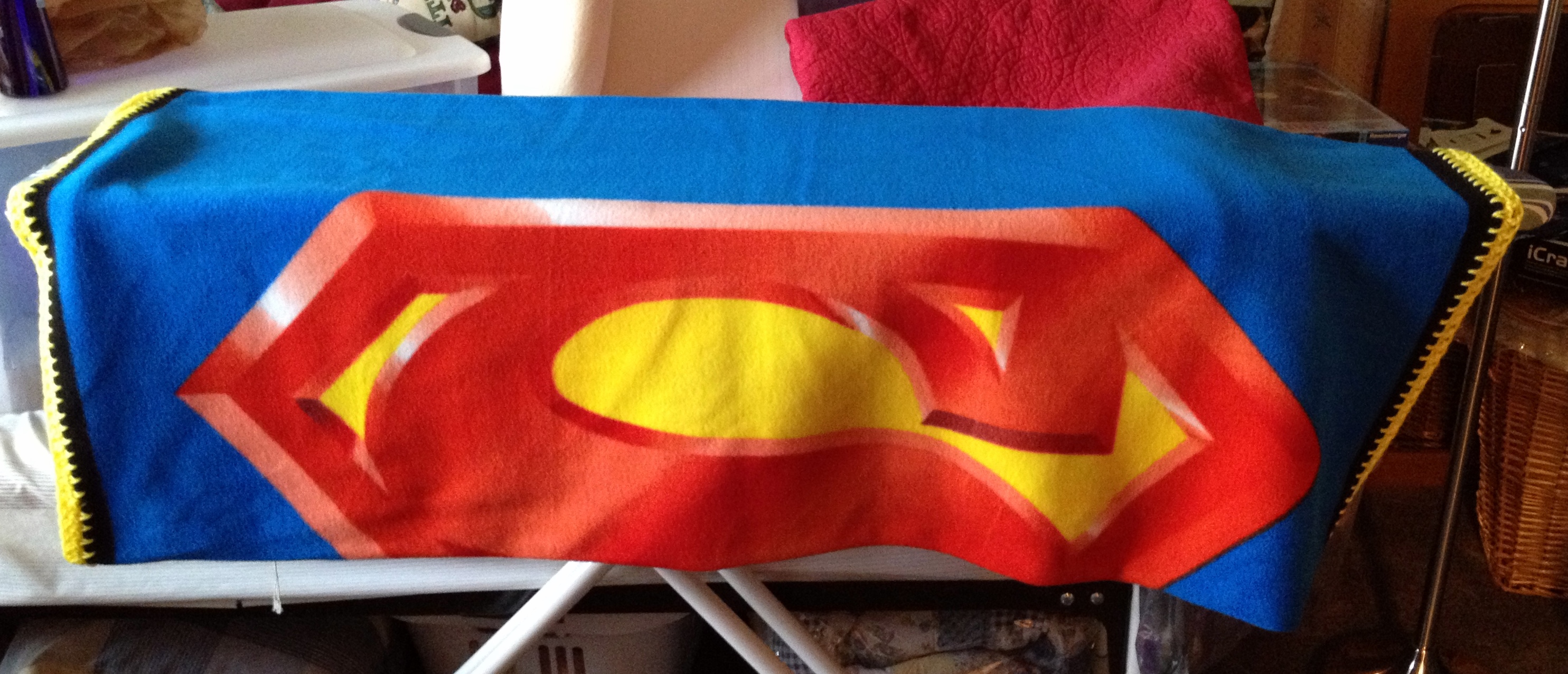 And finally, a Superman fleece panel that I hadn’t gotten to the month before. Edged in Red Heart Bright Yellow.