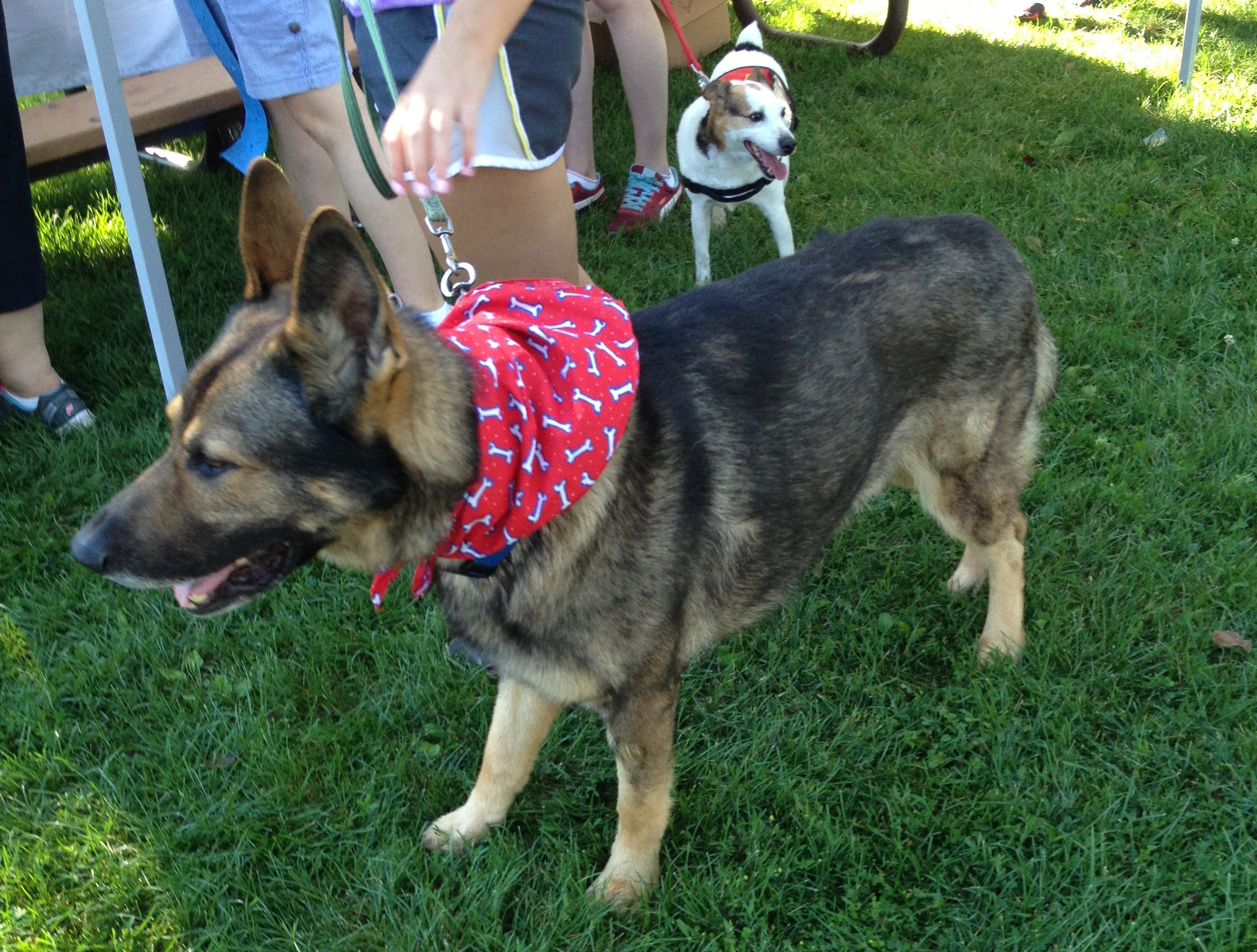 The GSD in front is not available for adoption (I took the pic because Fiona has a thing for GSDs) but Emiilio, standing behind, is available: