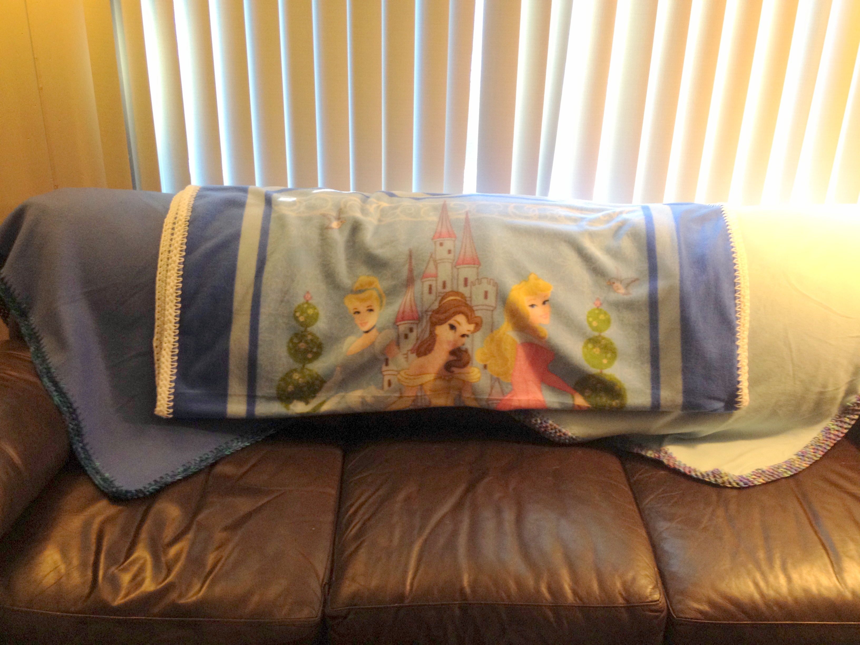 Doesn’t look like much next to the princesses, but I may have mentioned before: I don’t see many blankets out there appropriate for an older boy if he doesn’t like sports. This is my solution.
