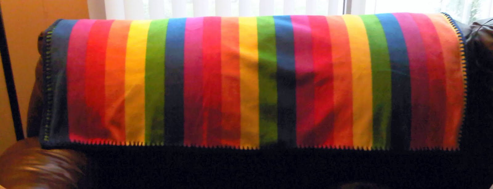Horrible cell phone picture of rainbow fleece edged in Loops & Threads Impeccable yarn in Royal:
