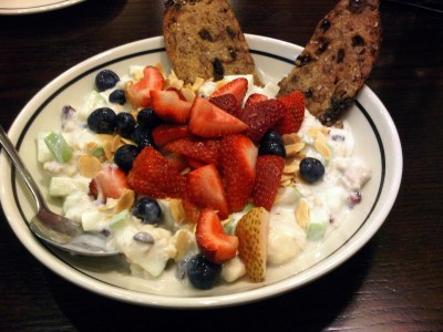 I am not the biggest fan of the Corner Bakery, but this – Almond Berry Swiss Oatmeal – is the best breakfast ever. Well. Best cold breakfast ever. The Chilled Swiss Oatmeal is a staple on the menu, but this version: with strawberries, blueberries and roasted almond slices, is only around in the summer. Vanilla yogurt, fresh apples and bananas, dried currants and the oats.