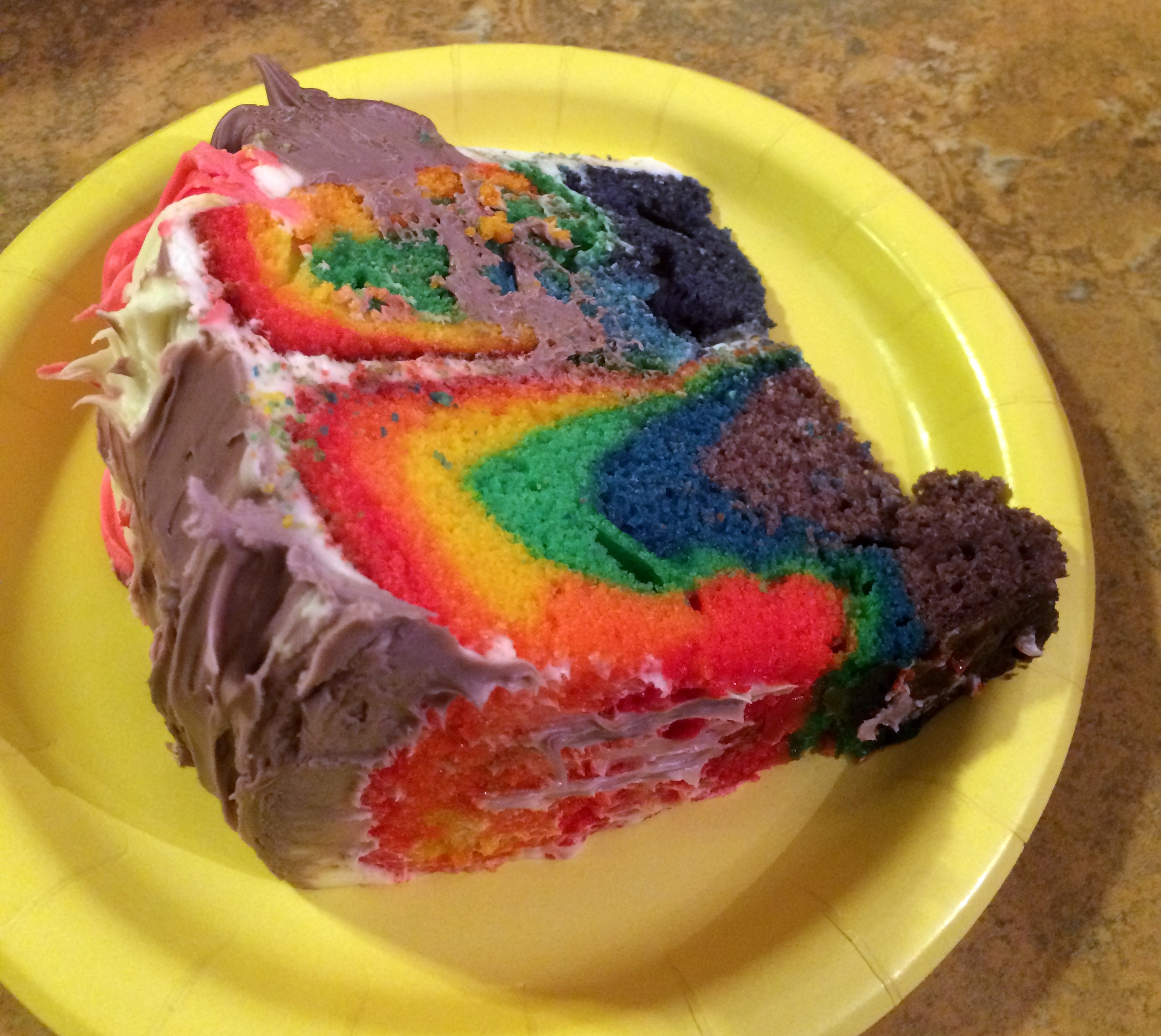 Justin rocked this. The recipe is simply yellow cake mix, prepared and separated into six cups. Then food coloring is added to each cup. Then the batter is poured into the baking pan one at a time for the swirl effect. Very pretty and very tasty. I found an online recipe if you don’t believe me.